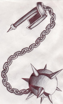 Finally finished! the coloring wasn't as difficult as I expected I just had to be patient and keep at it. the real problem was the main body of the shield, its black, but it needs to have some detail right? so after playing with the filters and tools I finally found something that I think works alright, and its still black.anyway, the premise here is similar to that of riot shields used by S.W.A.T. except instead of a taser we have sections of burning wax which can be used to burn the enemy when you bash them with the shield. And of course the shield is made of flame and heat resistant material.