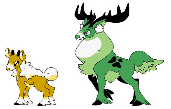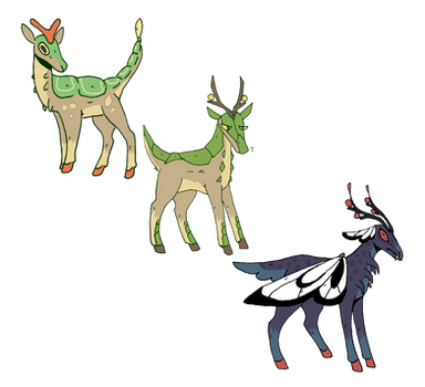 Deercoy, the Distraction Pokémon. Deercoy's high metabolism allows for them to look small and in many cases almost underweight. However this is a process of them having to store every bit of energy they can for their evolution, which also leads for them to be omnivorous. The spines between their shoulders, which seems to store energy, as long as they're up and their eyes bright show the Deercoy is in good health. Unlike many baby pokemon Deercoy play an active role during hunts with their adult herd members. Luring in pokemon and people alike within the range of their parents' ambush. Despite their role in the herd Deercoy are quite playful and friendly, showing a naive yet curious nature from a young age. No two Deercoy's spots have the same pattern.