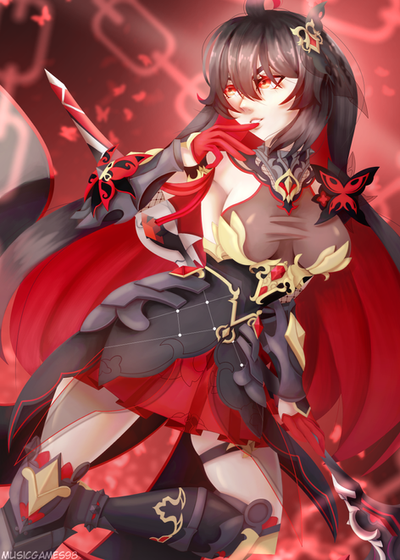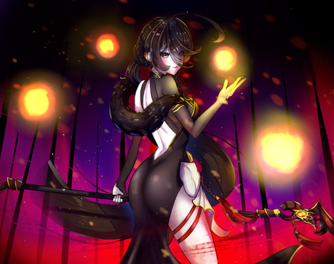first of all MOM HOLY FUCK this is a fantastic piece!!! the lighting is GORGEOUS and the coloring is great too, the color scheme here is absolutely solid and the gradients look beautiful without being overwhelming! i especially like the colors you used for the weapon, the lines look so smooth and well done on the areas with a lot of detail such as th weapon and her hip ornament. this background is amazing, you used a lot of different colors without the piece looking messy or strange and the background really works with the pose + character, the lighter orbs give it a nice touch of contrast against the dark background and accentuate the character. and OH MY GOSH. YOUR SHADING. as always your shading is GORGEOUS. while the hair is of course stunning as always (i would kill someone for how you shade hair i s2g) i really adore the shading you did on the more complicated parts of the piece, like her clothes! that dress in particular, and again the hip ornament, balances the detail of the outfit with impactful shading in a way that's easy to look at. you combined hard and soft shading really well here, with cel shading and painterly shading used in a way that provides visual contrast.