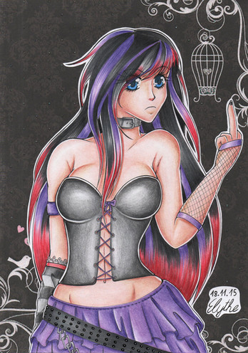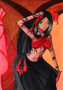 Diese Zeichnung ist einfach atemberaubend schön geworden *__* Hier stimmt einfach alles und ganz besonders gut finde ich deine Farbauswahl für die Colorierung. Diese satte Schwarz an sich ist ja schon super, aber die zwei unterstützenden Farben sorgen noch einmal für ein paar strahlende Highlights. Das Bild strotzt nur so vor Details, die du allesamt klasse hinbekommen hast und Rasheekas Gesichtsausdruck auf diesem Bild ist mir von all ihren Gesichtsausdrücken und -darstellungen auf deinen Bildern der liebste. Sie sieht hier einfach phänomenal aus Super gemacht!