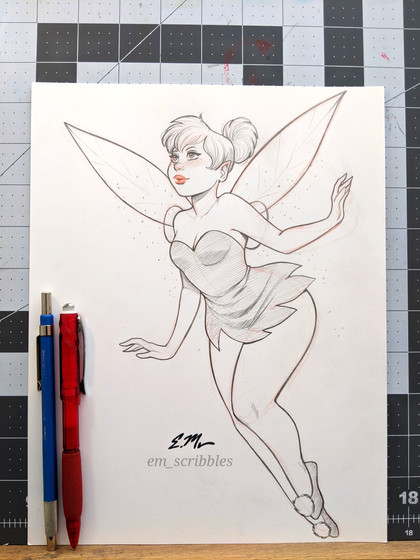 Here's a sketch of Tinker Bell that was done with ink and grey Copics.She's currently available on eBay:Β www.ebay.com/sch/em_art_commisβ¦