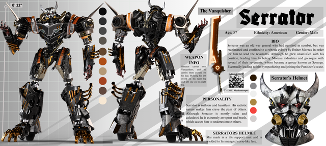 An updated design of my very first transformer character. He is an elderly bot with many centuries of war experience that refuses to retire in spite of his situation. Quite durable, he has put up with many beatings, with one being so severe that it sent him to death. But after being revived, his permanent injuries left an irremovable effect on his physical spark, resulting in frequent attacks and pains. Due to a lack of supplies and research, his medic and amica endura, Agate, has not been able to fix him, and is unsure if it is possible.Sprucehook is a wise old man that plays the game by his own rules and needs no one to tell him how to do his job. But sometimes this interferes with the poor relationship him and his captain have. He is friendly and loves to socialize, but appreciates his space and having plenty of time to relax and nap, becoming a grump if he is deprived from rest or has been putting up with too much of someones' irrationality. One of his top passions is music, especially from Earth radio, as listening to it helps with treating his PTSD.