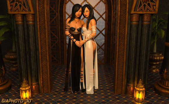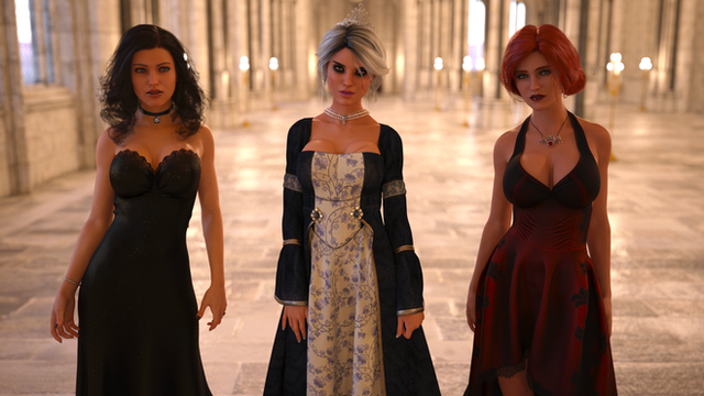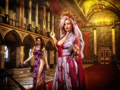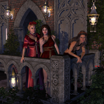 I ran across a picture of the Roberts Sisters from the game King's Choice and decided that if twins were good, triplets were better. The dress-pull could use some work (I couldn't find the right simulation settings to apply to these old converted Genesis 2 gowns that wouldn't result in a dForce explosion so I had to resort to using Mesh Grabber, which stretches out the textures and is generally less precise than simulation,) but I think the rest of it turned out pretty nicely. I might put up another cut of the image with a different (less golden) background and lighting scheme as well.
