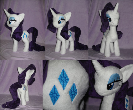 She's available for sale! Note me for detailsRarity is of my own 16" mare pattern and is made from Shannon minky fabrics. She has machine embroidered eyes, cutie marks, and artist mark on her front right hoof. Her hooves are filled with poly pellets so they stand flat and firm. Her face details are hand embroidered, and her mane and tail details are satin stitched. They are also wired for support