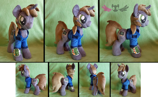 Pip and all her accessories are made entirely out of minky fabric. Her eyes, cutie marks, jacket, and pipbuck are machine embroidered. Her jacket is removable with a working zipperShe is a commission and not for sale, however I will be making a complete fallout equestria set soon ^-^