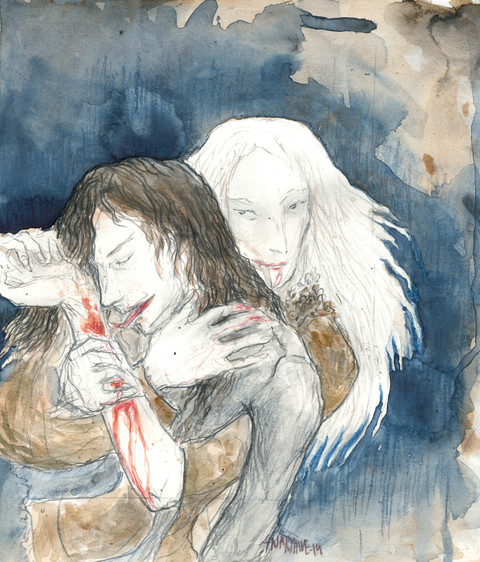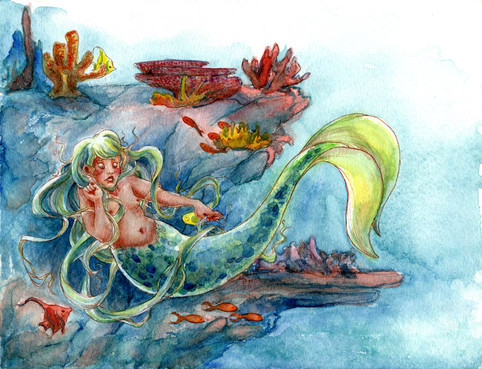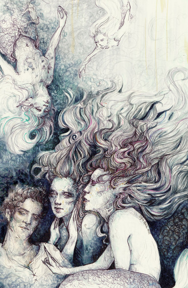 Long-planned, finally completed. Watercolor, gouache, and pencil on coldpress, 12x9".I'm not sure how evident it is anymore, but the initial drawing & concept were very much influenced by Celine Loup 's work.