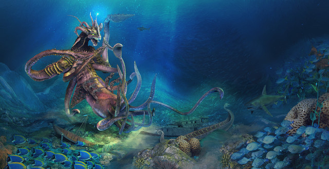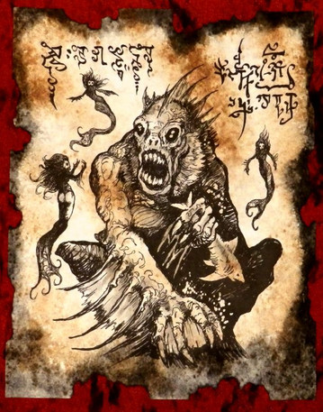 kinda. Lovecraft describes the monolith in great detail and then one of the monsters comes up out of the water to hug it, but I chose to dramatize the moment of it rising up and grabbing the monolith.