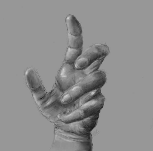 Doodle of my left hand, probably took, oh, 15 minutes? The GIMP was used.I wanted to keep working but I got interrupted, and I'll never get my hand in the same position and light again. I'll put up a proper drawing when I have the time to finish.