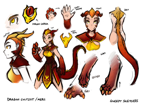 To fix this design on paper once and for all... well, until next change...Rogue is a tall and slender half dragon, born of a red dragon mother and an unknown father. Her egg raided during a violent war between humans and dragons, she was raised as a slave creature by a group of wizards called the Circle of Seven, leading the magocracy of Thrane-Kalor. Basically, she served as a study subject, and a source of renewable alchemical ingredients -her horns have been cut down at some point for this purpose. It wasn't considered amoral at all as dragons were then renowned for being evil and tyrannic beings, basically barely more intelligent than a smart animal -at least, that's what the wizards whom fought them for decades were saying.