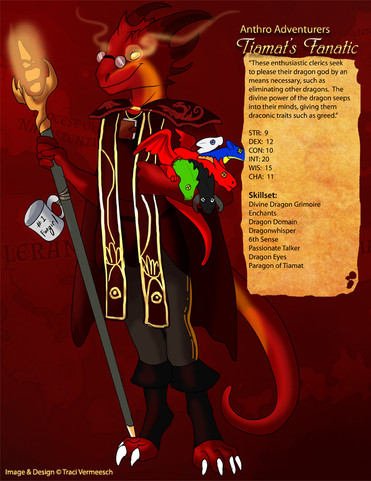 Despite her look, she's a calm and warm-hearted person, though quick to respond to sarcasms and insults. She has the tendency of her race to accumulate hoards of shiny objets, but has a special attraction for copper and brass jewelry, cause the color goes well with her scale colors. She's often seen carrying piles of books, studying any subject that could help the ship's crew members - her main magic school is invocation, but she learned to use defensive and protective spells for that purpose.