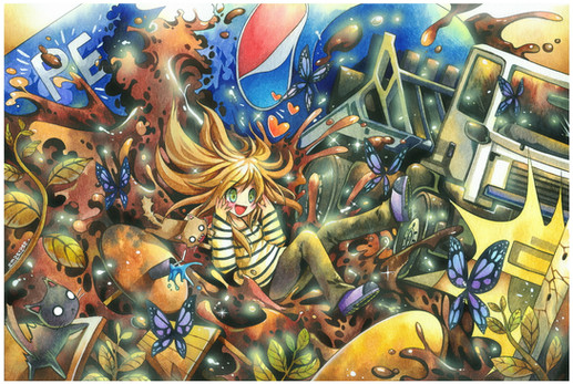 Artists' watercolors, colored pencils, ballpoint pens, airbrush