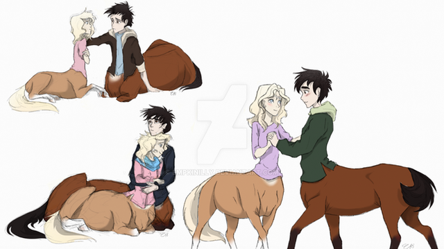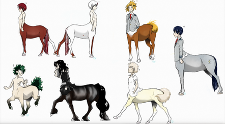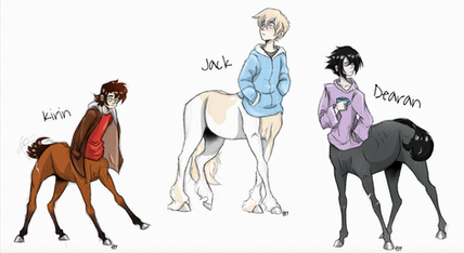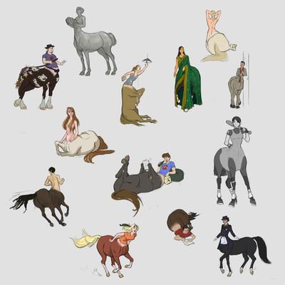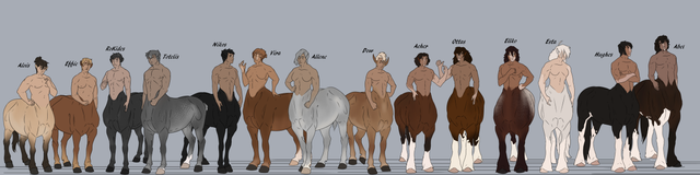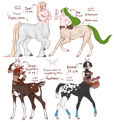 Top Right: A girl in her late teens with a golden palomino dun coat. She's about as small as a mini centaur can be, standing 4'11 feet tall from head to toe. Female taurs top off at about 15 y/o, while males can keep going until their late teens/early twenties.