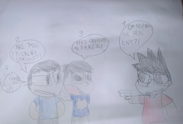Really??? More Bills? I need to get the intro page up, don't I? I have it inked and everything, but I just don't want to color it. And I don't want to write it. I've been losing my steam. But... I just can't stop drawing these freaking Bills!!! Their so adorable!!!In case your wondering, I had to do this for art class. Draw the same character doing the same thing but... not really. And since I have THE BEST TEACHER EVER, she allowed me to do Fanart! Yay!