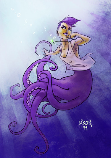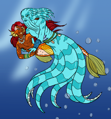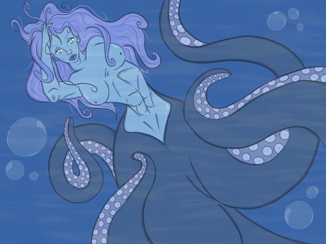 This drawing is very nice. The water doesn't blur the characters too much, and with how the octopus body and the human body are connected looks very fluid and natural. It is a really amazing job, though I have one question.