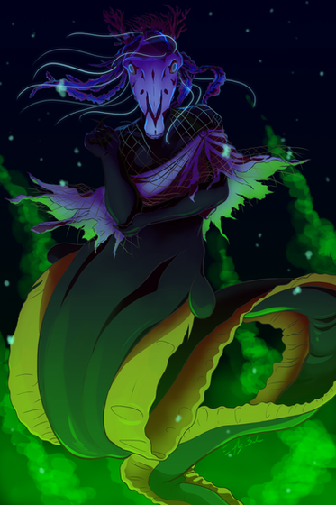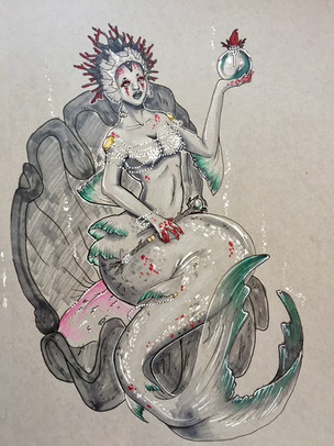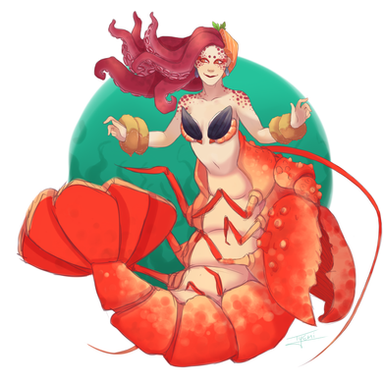 I'll admit, I haven't seen anybody else go into the direction of bringing in the roe into the equation. Along with the nod to the sushi roll with the headpiece makes it even more creative. My cultural knowledge still isn't perfect, so I'm having slight difficulty with distinguishing the exact culture you are referencing, still it's gorgeous from the color choices, the shading (especially on the tail, those scales are fabulous), and the posing which makes the whole thing come alive. The only thing that I could critique, or rather "things", are the breasts. They seem oddly spherical rather than a more natural shape. This could be seen as the breasts being suspended in motion, which would make sense, though the pose doesn't read that for me. Still, despite that the overall piece is gorgeous and I'm still mesmerized by that magnificent tail. <3