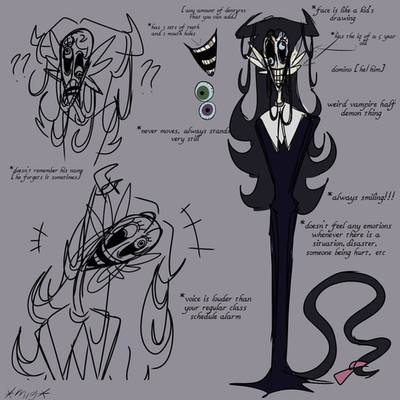 This is Father Longlegs, based of an old nursery rhyme that was rejected from mass publication for being too violent. I heard it from a video (Kudos if you can guess which one) and I just... instantly got this boi stuck in my head. He's such an odd design, I love him- I also wanted to practice with different silhouettes/builds, and this was a great exercise!