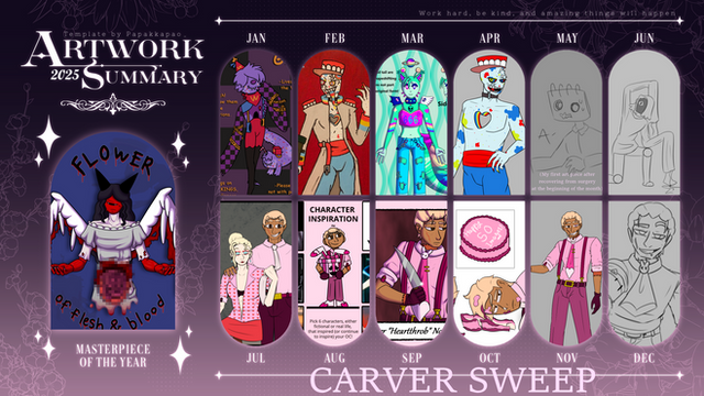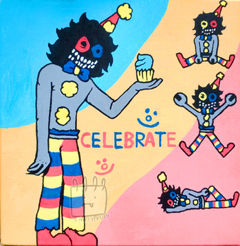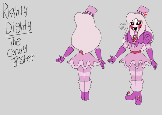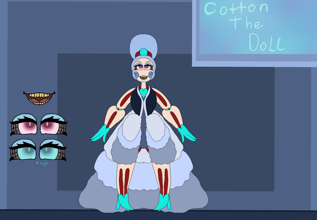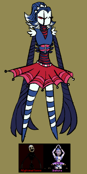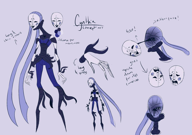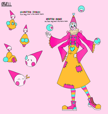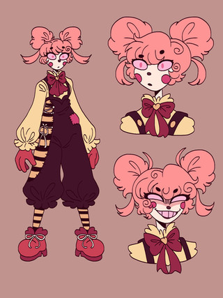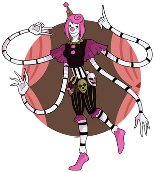I don't have a lot of Itsy-Bitsy's story really set up yet, but she's a very twistable stretchy clown that wears masks to show her emotions, and wields 2 to 4 Test-Your-Strength hammers. Also she's either filled with spiders or is a spider herself, who knows??? (Spider limbs were based off of a whip spider, aka my actual nightmares in spider form) She was also kinda made to be a mix of two large phobias, those being clowns and spiders of course.Β