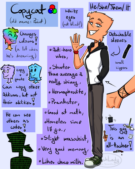 I love the name and the ideas you have with this character. You can tell that you spend time thinking about them. The only thing is I think it could be a bit more original since I have seen a few characters somewhat like this, that and I think it would of been cool if you gave them things like stains every once in a while on their clothes since after all they are always working with things like paint, graphite and such, and they are working with a white shirt. Especially on the sleeves. Unless maybe you give them a different outfits and make it so they have one for when they are drawing, and what they casually wear.