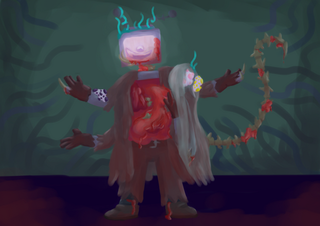 General gist on him is that it's an entity that sorta corrupts whatever area it's in to be all fleshy and gross. Like a walking crimson biome from Terraria- Organic objects will start to grow meaty film and sometimes eyes or mouths around him and they'll stick around until removed. God help you if you end up in his AoE, you'll begin to melt.
