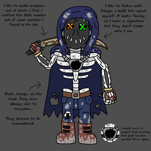 For eight years, eight long years he wandered the ocean depths, trying to find his way back home and having plenty of time to question his creator, and organics in general. How all those he had socialized with had always thought short term, never realizing how small their lives were, how pathetic they were in comparison to him, an unaging invincible machine. He stewed over these thoughts for years, before he eventually came across an entity, at the very bottom of the sea. The entity was shocked that any being could possibly make it as far down as they were, and was impressed by the strange metal thing. He offered XIII a deal, to act as his will outside of the sea, and in return, he would bless him with his own personal abilities, able to summon his patron's tentacles, disguise himself at will, and wield terrible magical power. XIII agreed completely, and his patron opened up a gate to send him back to shore.