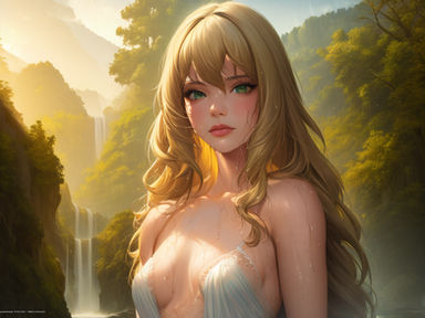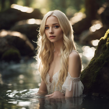 #ai #blonde #closeup #erotic #foliage #forest #pond #portrait #rain #sun #water #woman
