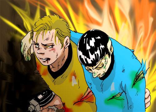 Oh my Jim is determined to kick some alien butt.. Besides being angry he looks like he's going to cry....or he is in so much rage now, It seems he's looking at his enemy and wants to kill them where they stand for hurting Spock...well done....