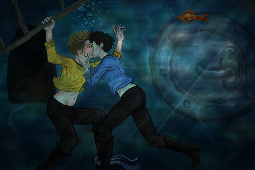 As always, I love your art. I love the way you draw Kirk, how you make him look like himself, yet with your own, interesting touch. I love the way he's slowly sinking into the water. I also love the way you've drawn the water, with the whiteness billowing in the deep blue. This seems to me like how a mind meld might feel. I like the hand (Spock's, I assume) reaching into the depths to touch Kirk's face. Again, puts me in mind of a kind of meld.