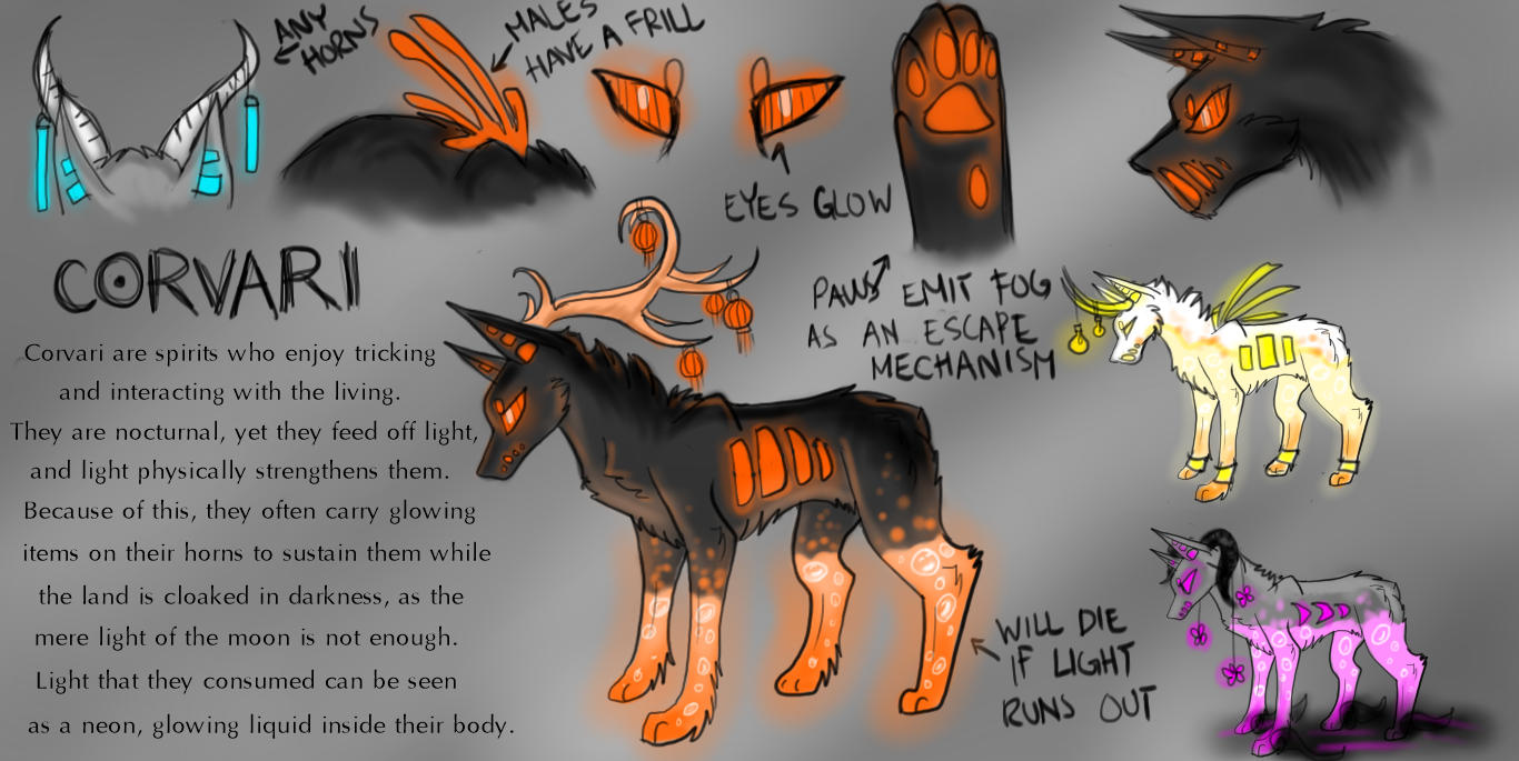 Most of the basic information is shown in the picture. Corvari are primarily sustained by light and physically eat and feed off light, although they are nocturnal. The reason they are not diurnal is because if they unknowingly absorb too much light in the daytime, they will explode and die. Even though they are spirits, they do have a physical form during the night, but they're more like ghosts during the day and hide away in the shadows while the sun shines. They mainly come out at dusk and hide at dawn.