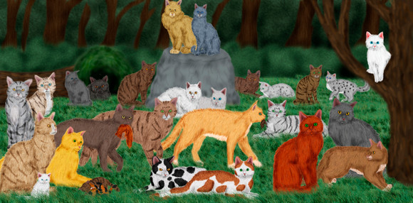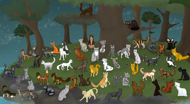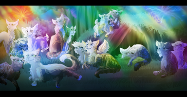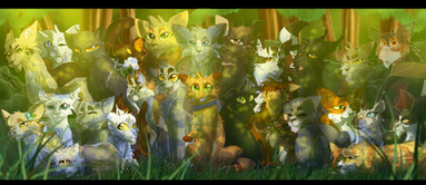 left to right, the cats are: Lotuspaw, Icegaze, Wrenkit, Dustfur, Honeybee, Dewbreeze, Rainpaw, Minkfur, Larkstar, Whisperpaw, Cedardrop, Owlkit, Driftpaw, Halfrose, Fadedvision (that's me cx) and Tornsoul.