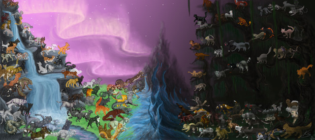 Oh my goodness, this is so incredible. I am speechless, I love this so much. The colors are beautiful, and the cats are drawn really well. Good job <3