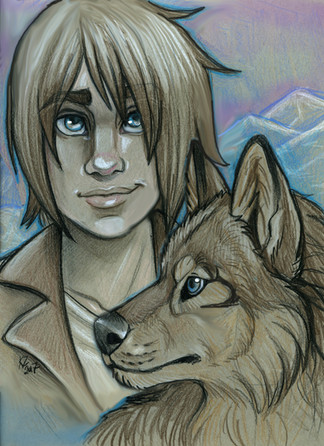I have never in my life seen this anime XD But the style of this is just so adorable! His face especially intrigues me and makes me giggle at the same time. I love how you did his profile, and both the boy and the wolf's running poses are awesome...the coloring style in this is so nice and clean too, a real treat to the eyes.