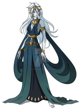 The 'dress' adorning her body is actually part of her living being, her body's form and appearance adaptable to her will. As such, she is always technically 'naked', but it doesn't seem to bother her too much. Her natural form is the same appearance stripped of the 'dress'. The crystals adorning her body are seemingly the only artificial part of her, created by a higher power. They seem to be the source of her great strength and abilities.
