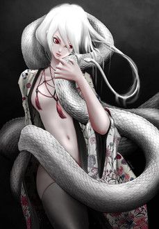 It struck forward, sinking its fangs deeply into the angel's right shoulder and injecting its dark 'venom'. The once pure skin fell victim to agony and a dark, visible corruption, and the angel, in a desperate bid to survive, did not fight back, instead vanishing as quickly as she had come. A bewildered Sebina in her wake. But time came to pass regardless, and the longer Sebina spent time with the serpent, the more true Genevere's grim hunch came to be. The darkness within Sebina was brought out by the God, who had chosen her not only as his champion, but as his partner in misdeeds. The God was Omen, known well by Sedna once upon a time, and he promised her that with her help, they would know him again. At 15, she would learn to love the shadows of the night far more than the light of day. 16, and her innocence devolved into criminality. 17, and she would begin to grow into the God's own tastes for 'fun', and slowly start to share them. They would visit unfortunate, randomly chosen citizens to act upon these desires.