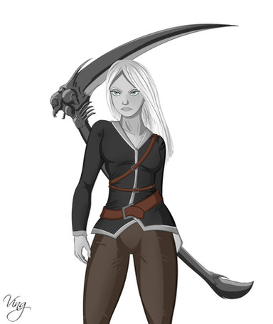 Though she's extremely capable without it, her scythe has unknown properties that imbue her with even greater power than normal, practically doubling her already great strength and abilities in combat.Β In the rare instances an enemy has landed a blow on her combat or tried to her harm her in anyway, she has not shown any sign of feeling pain, and the wounds seem much less severe than they should be, so long as the scythe is in her possession.Β This greater power will remain with her so long as the scythe is upon her, whether she's holding it or simply resting it strapped to her back. She's affectionately taken to calling it her Maiden, though the origin of that nickname is something she refuses to reveal. Many enemies are unaware of this greater power, taking it for her natural strength since she and the weapon are virtually inseparable.