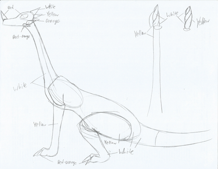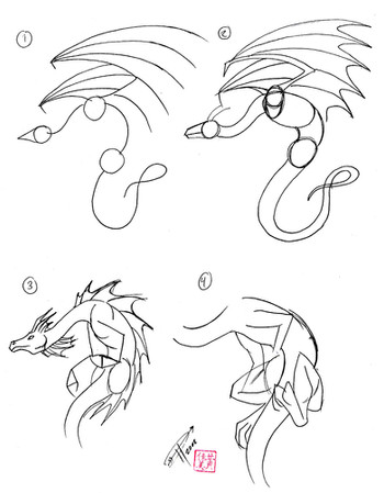 An example of how the method is put to use in a full body dragon. I usually draw the chest larger than the stomach, this one with an angular front, others may round it to look more like a rib cage.