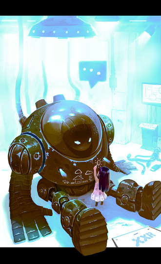 I adore her girlish body language and your use of child crayon drawing in speech bubbles to convey her enthusiastic innocence. And the robot seems so intent on listening. Really sweet.
