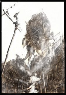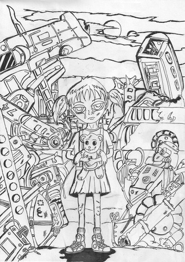 Wow. The first time I looked at this, I just saw the frail little girl with the piles of junk, but now I see the looming, clawed monstrosity behind her. I like how the pieces of garbage are flying off the ground to join with the guardian. Also, I like the "thrown together" appearance of the fangs and jaw. Just out of curiosity, how would one go about slaying such a creature?