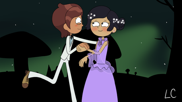 The background makes no sense: the twisting staircase is supposed to be in the foyer, not the ball room; same goes for the plants, with the addition that the irrigation system is supposed to be in walls, not in these railing waterfall things. This background doesn't even have anything in it indicating that it's in Amphibia, I just drew a heart and turned my brain off in my attempts to make it fit.