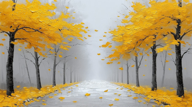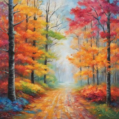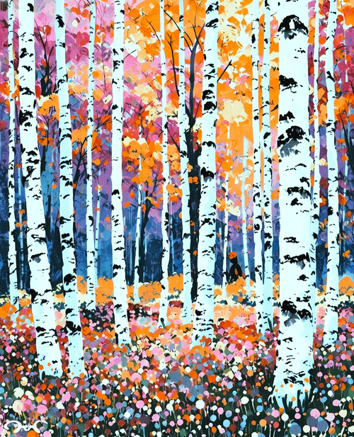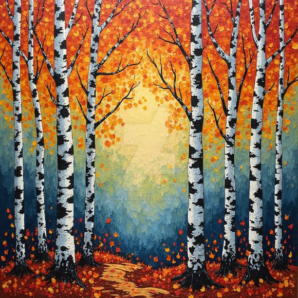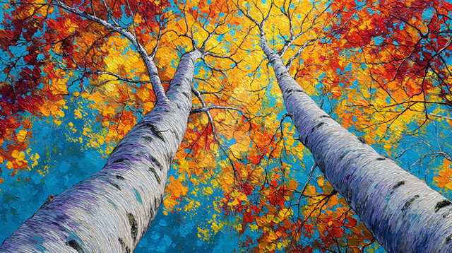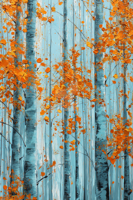 #forest #aspen #autumn #blue #bright #brushstrokes #colorful #fall #foliage #impasto #impressionism #landscape #modernart #nature #orangeleaves #painting #perspective #seasonal #serene #sky #textured #trees #vertical #vibrant #art