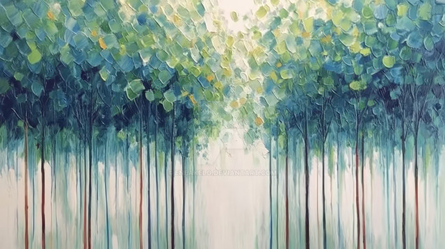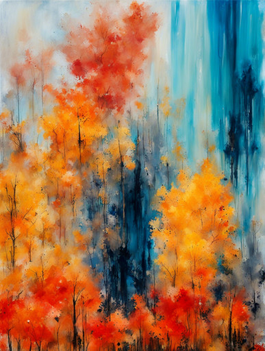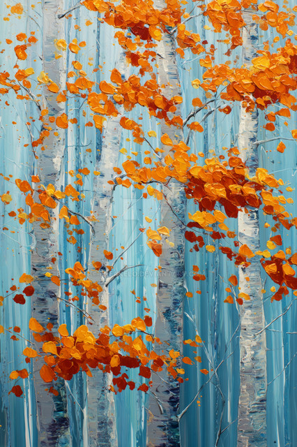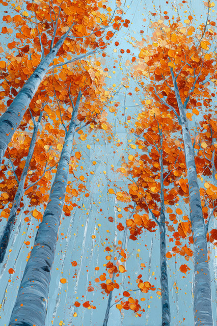 #forest #aspen #autumn #blue #bright #brushstrokes #colorful #fall #foliage #impasto #impressionism #landscape #modernart #nature #orangeleaves #painting #perspective #seasonal #serene #sky #textured #trees #vertical #vibrant #art
