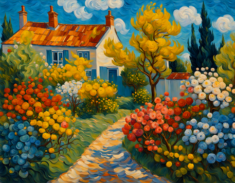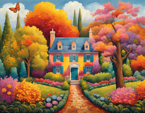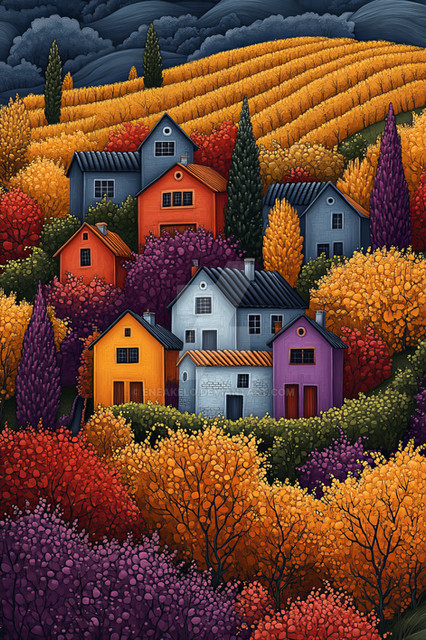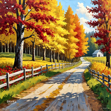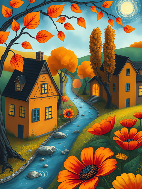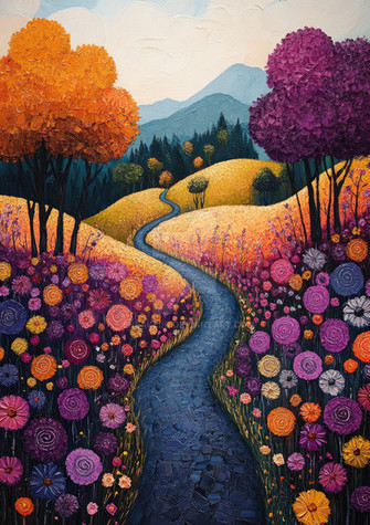 #artwork #autumn #blue #composition #flowers #goldenleaves #impressionistic #lake #landscape #mountains #nature #outdoor #painting #path #picturesque #pink #purple #river #scenic #stonepath #tranquility #trees #valley #wildflowers #yellow #colorfulvalley