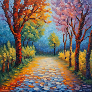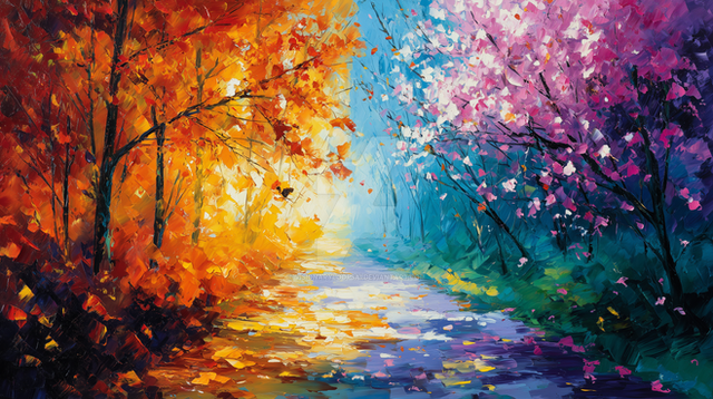 #artwork #autumn #blue #composition #flowers #goldenleaves #impressionistic #lake #landscape #mountains #nature #outdoor #painting #path #picturesque #pink #purple #river #scenic #stonepath #tranquility #trees #valley #wildflowers #yellow #colorfulvalley