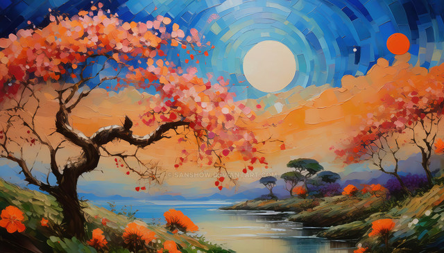 #black #blue #botanical #brushstrokes #contemporaryart #darkbackground #depth #energy #expressive #foliage #impasto #landscape #luminosity #modernart #nature #painterly #painting #red #reflection #solitary #tranquility #tree #vibrant #warmcolors #water #yellow #art