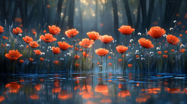 #beauty #floral #contemporaryart #dreamlike #flowers #forest #grove #lake #landscape #light #modernart #mystical #nature #orange #outdoors #painterly #painting #peaceful #pond #poppies #reflection #romantic #serene #shadow #stilllife #tranquil #water #art