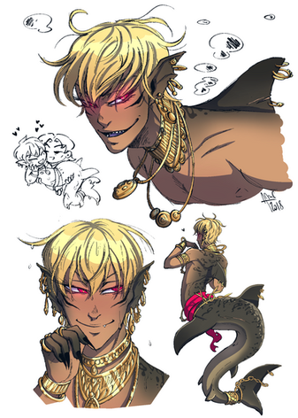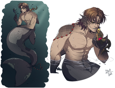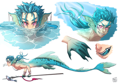 Mermaid Caster from a 2018 design, what do you say...? Would you swim with him?#35 illustration for the Monster Challenge, one picture a week!