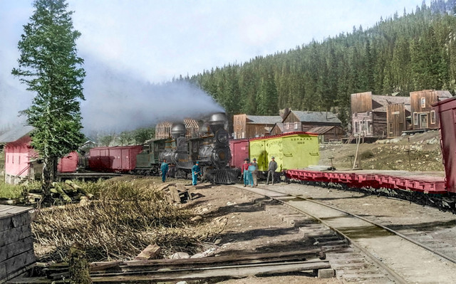 A set of GP9 Diesel Locomotives shoves hard against the tail end of a RP&P coal train, near Peabody, in the early evening.In the case you were wondering, after some experimentation, due to the fact that the line was built at a gradient of about 2.5%, each locomotive is limited to 6 loaded 100 ton hopper cars and a caboose.