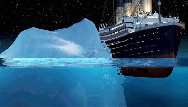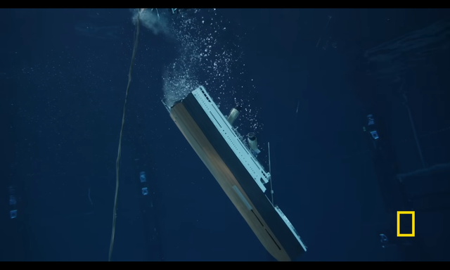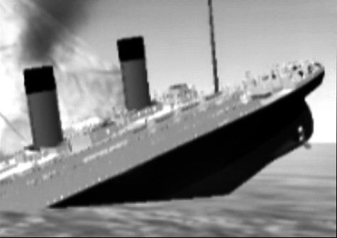 As the bow fills with water, the air in the stern forces it into the air. People rush to the stern in the hopes it will stay dry.Colorized for