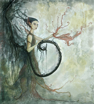 I love the texture of her hair/branches, the Klimtesque swirly patterns, and the shapes of her face. Lovely!