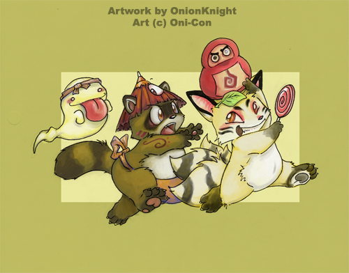 Simply adorable! xD I can imagine the tanuki saying "Give it back!! :<" while the kitsune says "A kappa! Amazing! O:"