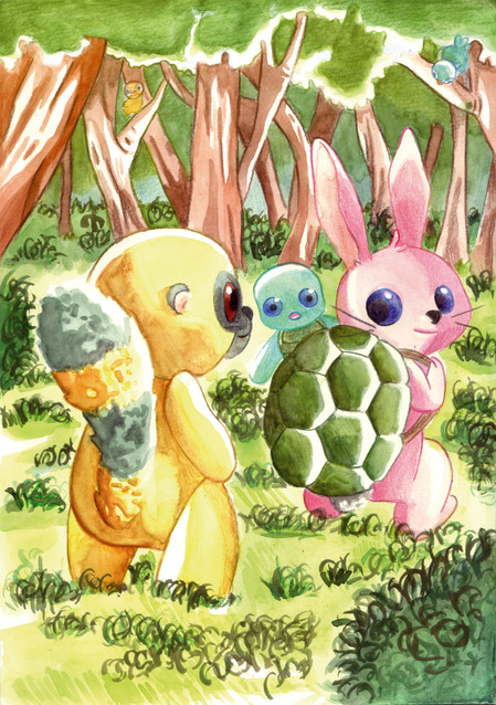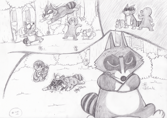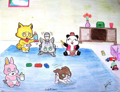 In spite of its roughness, this is still a pretty neat drawing. Saying how much I enjoy the expressions of your characters is becoming repetitive I know, but I just really do adore how you draw them; the expressions of the Panda and two onlookers are done rather well. I also notice that the little fox at the bottom of image seems to be chasing his fish that are somehow tied to a balloon (correct me if I'm wrong ). Interesting yet really cute, especially since the focus is supposed to be on the other two. An adorable piece that leaves the viewer to forget that it is a rough drawing. Great work!